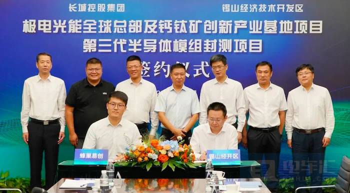8月16日,长城控股集团与江苏省锡山经济技术开发区签约战略合作,无锡极电光能科技有限公司(以下简称“极电光能”) 全球总部及钙钛矿创新产业基地项目、长城旗下蜂巢易创第三代半导体模组封测制造基地项目落地锡山经济技术开发区,计划投资38亿元。
