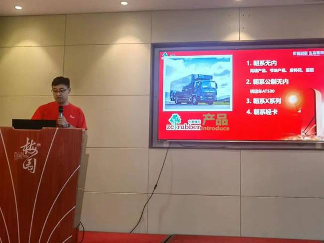 会议开始,中策橡胶集团轮胎销售技术顾问徐钦结合福建地区全钢产品的使用场景,重点讲解了相对应的中策全钢产品。在2022年新一轮产品优化中,中策工厂对朝系“公制无内、高端无内、节油无内、有内载重、矿区专用、有内买断、精品轻卡”等七大领域产品在设计、工艺、材料等多个方面围绕用户需求进行了再升级。针对福建市场特点,徐钦现场重点围绕中高端长途产品、轻卡产品和X系列快速理赔产品进行了重点讲解,让福建团队深度挖掘市场需求,携手渠道一同去满足车队用户的诉求。