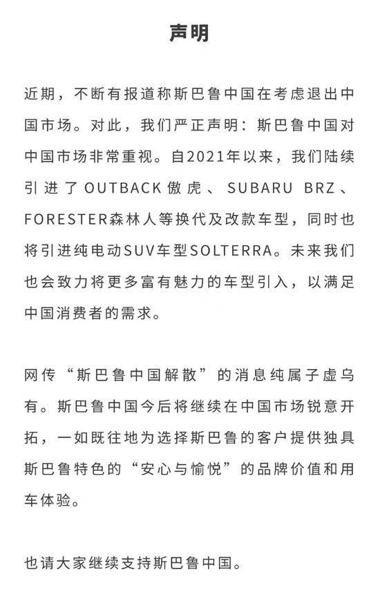 针对近期不断有报道称斯巴鲁中国在考虑退出中国市场这一消息,斯巴鲁中国日前给出官方回应:斯巴鲁中国对中国市场非常重视。自2021年以来,我们陆续引进了OUTBACK傲虎、SUBARU BRZ、FORESTER森林人等换代及改款车型,同时也将引进纯电动SUV车型SOLTERRA。未来我们也会致力将更多富有魅力的车型引入,以满足中国消费者的需求。