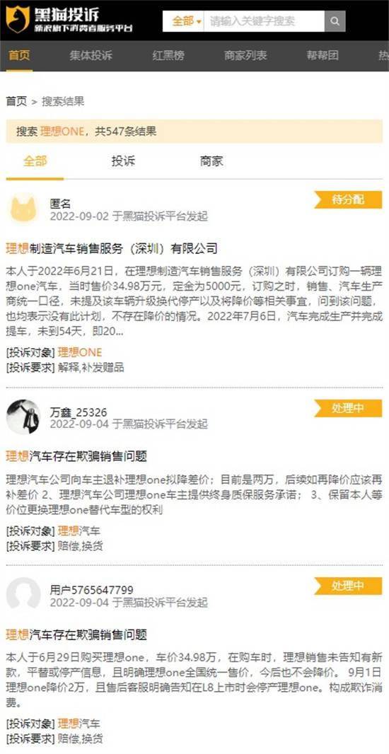 网络投诉平台对理想ONE的投诉
