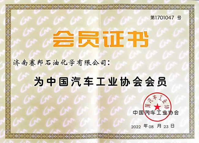 经中国汽车工业协会批准:济南赛邦石油化学有限公司成为中国汽车工业协会会员单位。并获颁会员单位证书。