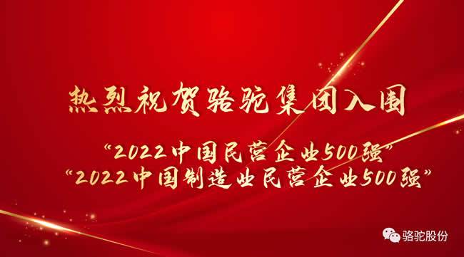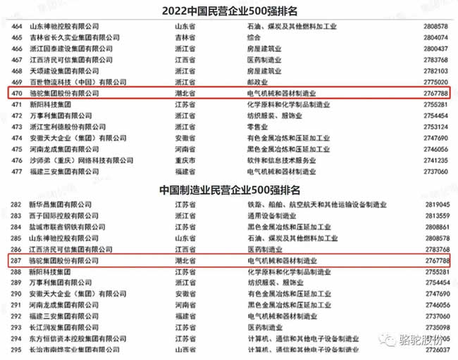 此次,骆驼股份以276.78亿元的营业收入位列“2022中国民营企业500强”第470位,“中国制造业民营企业500强”第287位。