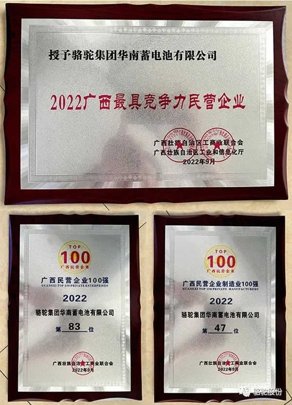 骆驼集团华南蓄电池有限公司自2021年荣获百强企业后,2022年继续蝉联榜单,荣膺“2022广西民营企业100强”第83位,“2022广西民营企业制造业100强”第47位,“2022广西最具潜力民营企业”殊荣。