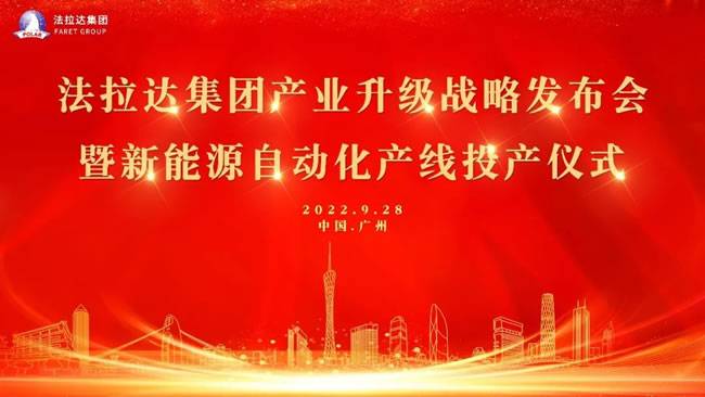 2022年9月28日上午,法拉达集团隆重举行产业升级战略发布会暨新能源自动化产线投产仪式并获得圆满成功。番禺区委常委、常务副区长麦洁萍,广州市中小企业局三级调研员麦洪辉,番禺区沙头街党工委书记黄海滨,番禺经济开发区管委会常务副主任夏平,番禺区科工商信局副局长苏俊丹,番禺区有关部门、沙头街有关领导,广东省中小企业发展促进会会长谢泓,广州智光储能科技有限公司副总经理付金建,华南理工大学机械与汽车工程学院简弃非教授,法拉达集团董事长张建发,以及法拉达的管理团队,法拉达客户朋友们共同见证法拉达集团产业升级战略发布和新能源自动化产线启动投产。