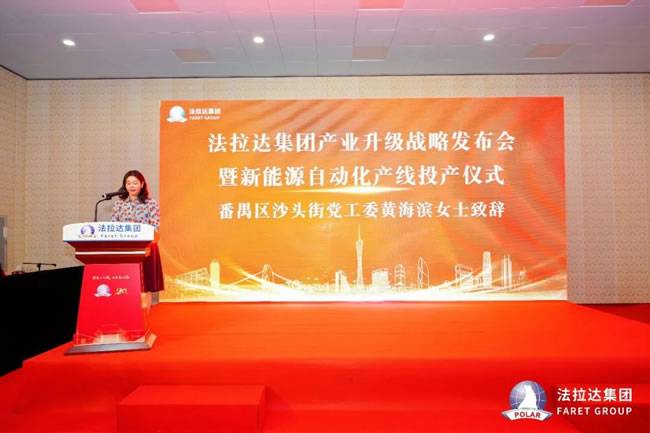 番禺区沙头街党工委书记黄海滨女士发表讲话,表示法拉达集团作为番禺区的先进制造业代表企业,在各个方面具有一体化的领先优势。希望法拉达集团继续传承和发扬敢于进取、锐意创新的企业精神,充分发挥工程技术优势,加大研发投入,拓展市场空间,打造汽车热管理领域的标杆企业,为沙头街,为番禺加快建设先进制造业强区作出新的更大的贡献。