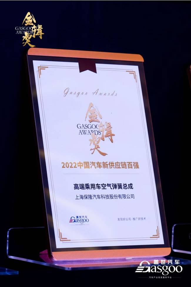 保隆科技凭借在空气悬架系统领域的技术优势、成本管控优势、量产供应经验、制造创新性、应用成熟度及良好的发展前景,使高端乘用车空气弹簧总成项目从众多入围项目中脱颖而出,获得专业评审会的一致认可,并成功获奖。