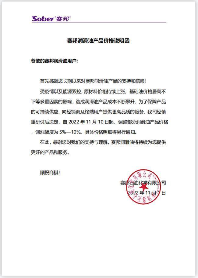 首先感谢您长期以来对赛邦润滑油产品的支持和信赖!赛邦润滑油产品价格说明函尊敬的赛邦润滑油用户:首先感谢您长期以来对赛邦润滑