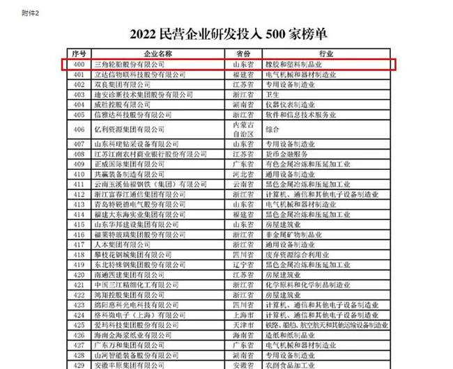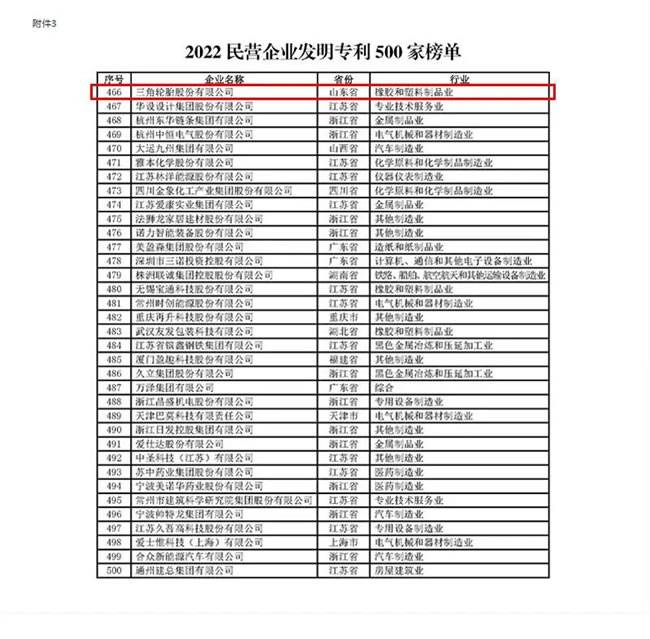 近日,全国工商联发布2022民营企业研发投入和发明专利榜单,三角轮胎凭借在技术创新、产品研发等方面持续投入,荣登“2022 民营企业研发投入500 家”和“2022 民营企业发明专利500 家”榜单。