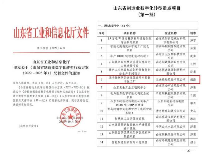 近日,山东省工业和信息化厅对外公布了山东省制造业数字化转型重点项目、重点支撑平台(第一批)名单,共有3家轮胎企业的3个项目,进入重点项目名单。其中,三角轮胎的“基于物联网的高性能商用车胎数字化工厂项目”荣登榜单。