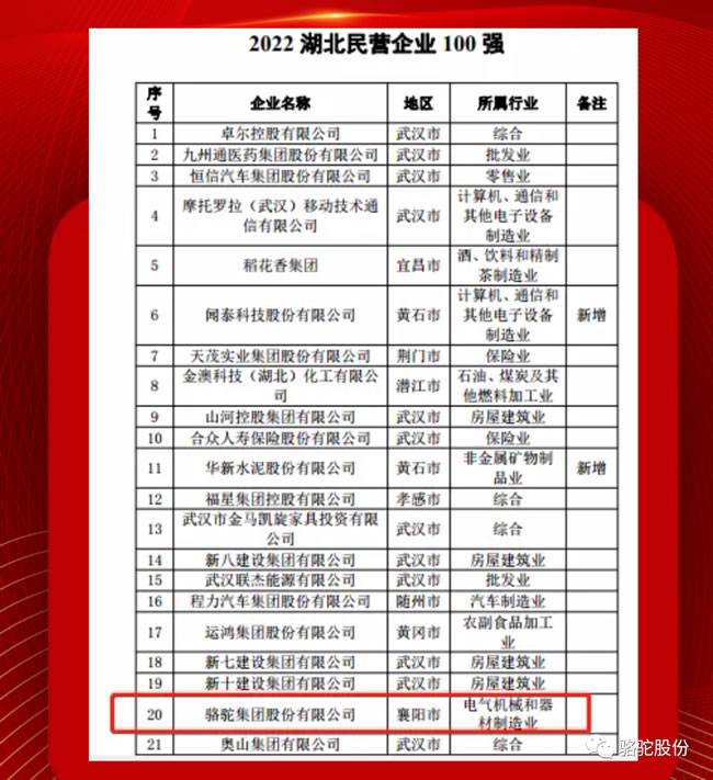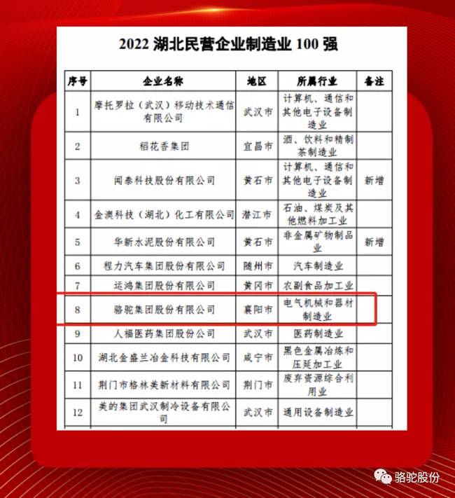 此外,发布会还同步发布了湖北民营企业制造业百强榜单,其中骆驼集团股份有限公司位列第8位。