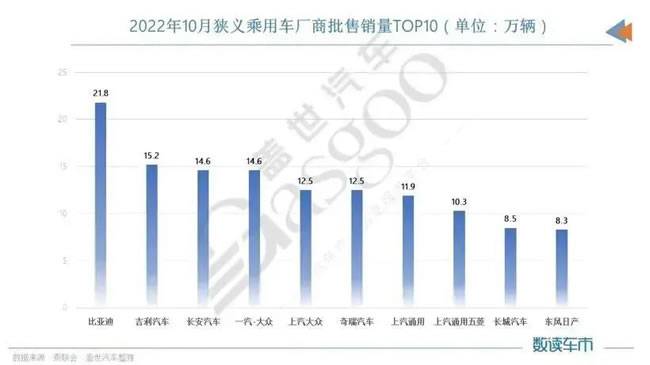 10月销量破10万辆的自主车企还有上汽通用五菱,此外,已经阔别榜单许久的长城汽车,也凭借8.5万辆的月销量,拿下了第9名。与主流自主车企集体向好的大势形成鲜明对比的是,曾经强势的合资品牌,在10月份集体势弱,市场份额被自主反超,在销量前十榜单上的席位也被抢走了不少。10月销量破10万辆的自主车企只有南北大众和上汽通用,排在第10位的东风日产,月销量只有8.3万辆。