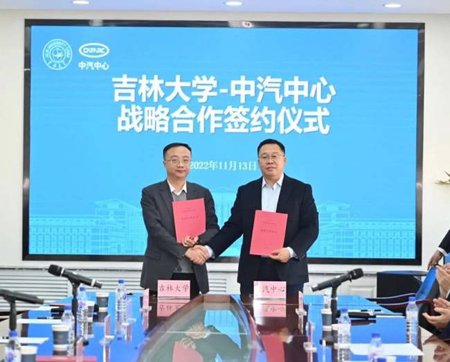 2022年11月13日,中国汽车技术研究中心有限公司(简称“中汽中心”)走访吉林大学并正式签署战略合作协议,双方将围绕人才培养、招聘就业、科技攻关、实验室建设、奖学金设立等方向建立长期战略伙伴关系。中汽中心党委委员、副总经理周华,吉林大学党委常委、副校长赵宏伟出席签约仪式并签署协议 。
