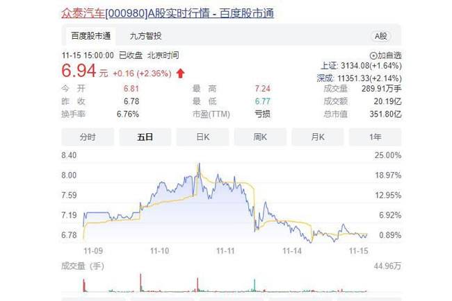 日前,众泰汽车股价持续波动,甚至一度逼近跌停,11月14日收盘,众泰汽车收跌9.72%,报6.78元。而截止今天(11月15日)收盘,众泰汽车报6.94元,有所微涨。据了解,在11月11日晚间,经历7天6板后触及跌停的众泰汽车(000980)再次回复了深交所的关注函,但几个小时后公司便披露收到证监会浙江监管局的警示函,指出公司违反了《上市公司信息披露管理办法》相关规定。