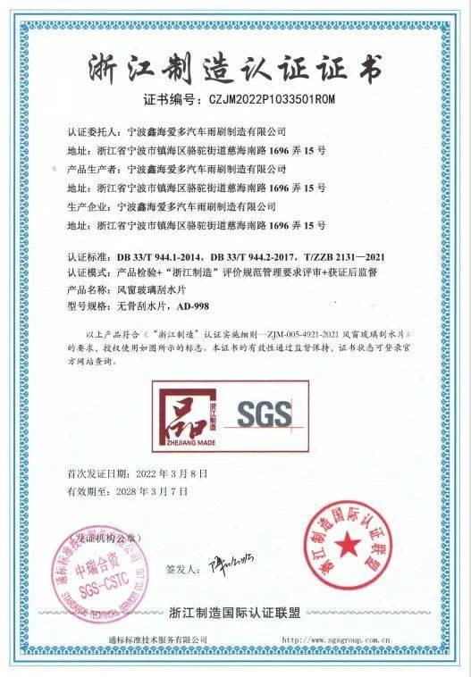 更为值得骄傲的是今年年初,爱多雨刷正式获得《浙江制造认证证书》,此证书由浙江制造国际认证联盟和中国质量认证中心联合签发,这也意味着“爱多雨刷”成功通过了浙江制造业含金量最高的标准认证,获得了“品字标”,充分说明了爱多在汽车雨刷行业高质量发展的道路上又迈向了新的高度。