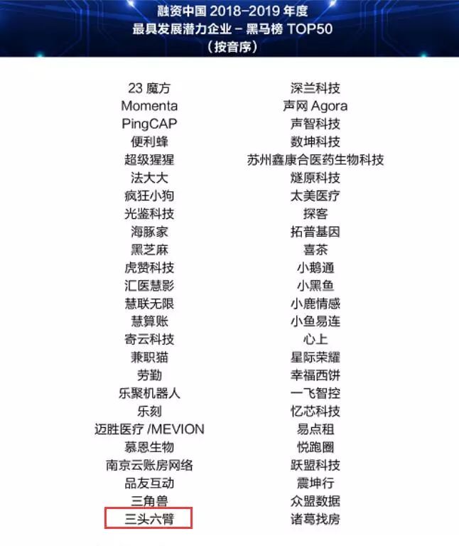 在公布的各行业巨头云集的“融资中国2018-2019年度最具发展潜力企业—黑马榜TOP50”中,我们惊喜地发现“广东三头六臂信息科技有限公司”位列该榜单中。
