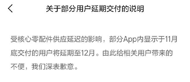 11月27日,理想汽车发布"关于部分用户延期交付的说明",说明中称受核心零配件供应延迟影响,部分理想汽车App内显示于11月底交付的用户将延期至12月。