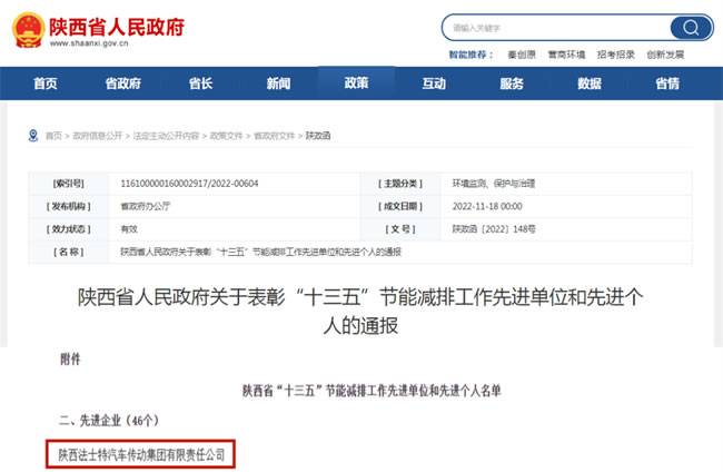 近日,陕西省人民政府网站发布《关于表彰“十三五”节能减排工作先进单位和先进个人的通报》,陕西法士特汽车传动集团有限责任公司荣获“十三五”节能减排工作先进企业荣誉称号。