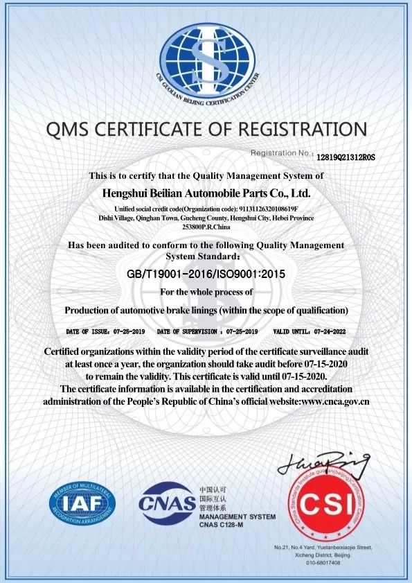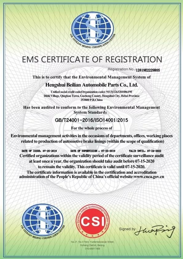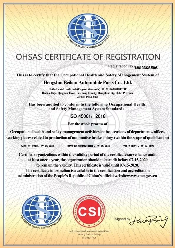 2019年7月,嘉联达刹车片向中标研国联(北京)认证中心提交了质量管理体系ISO9001:2015、环境管理体系ISO14001:2015和职业健康安全管理体系ISO45001:2018的新认证申请。而后中标认证中心的老师们亲自来嘉联达生产工厂,进行了为期一周的审核,对文件、现场管理及生产环境均进行了检查与认定。