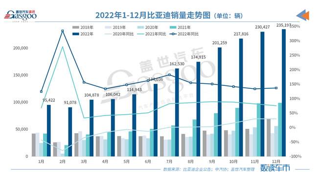 据比亚迪在2023年1月2日晚间披露的数据显示,12月,比亚迪新能源汽车销量23.52万辆,上年同期为9.91万辆,同比增长137.30%。至此,2022年内比亚迪新能源汽车累计销量186.85万辆,同比增长152.46%。