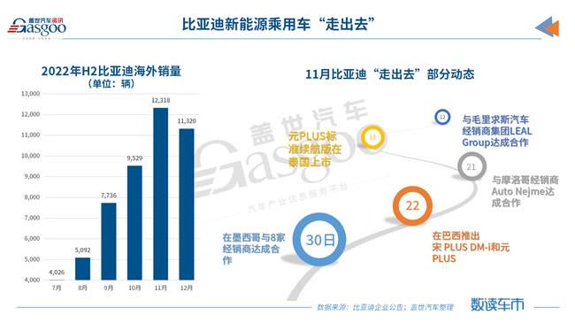 基于此,进入2022年下半年以来,比亚迪新能源乘用车海外销量逐月攀升,至12月单月销量突破万辆,达11,320辆。仅2022年下半年,比亚迪新能源乘用车便已出海超5万辆新车。