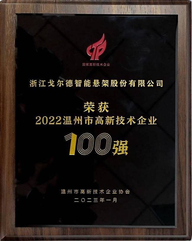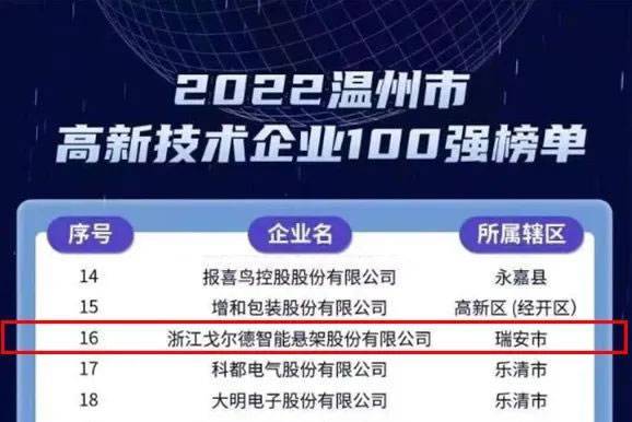 以“创新之花”酿出“发展之蜜”。1月3日下午,“2023温州万企创新蜂巢大会”顺利召开。大会现场发布了2022温州市高新技术企业100强榜单,该榜单依托温州市高新技术企业协会,通过对企业发明专利、研发经费、主营业务收入等多指标的综合比对,评选出发布。戈尔德智能悬架股份有限公司荣誉上榜,并获取第16名。