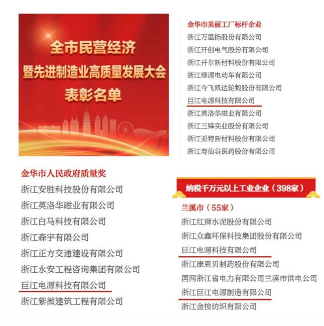 在本次会议上巨江电源科技有限公司接受了“金华市美丽工厂标杆企业”、“金华市人民政府质量奖”以及“纳税千万元以上工业企业”三项表彰(浙江巨江电源制造有限公司也获得纳税表彰),浙江巨江新能源科技有限责任公司与兰溪市政府签约“新能源锂电项目”。