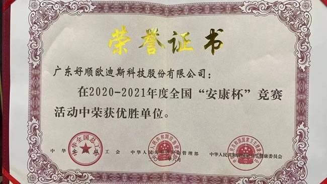 近日,中华全国总工会、应急管理部和国家卫生健康委员会联合发布表彰2020—2021年度全国“安康杯”竞赛活动先进集体和优秀个人。好顺科技从65.4万多家参赛企业中脱颖而出,荣获2020—2021年度全国“安康杯”竞赛优胜单位称号。这是一个带着国徽章的证书!
