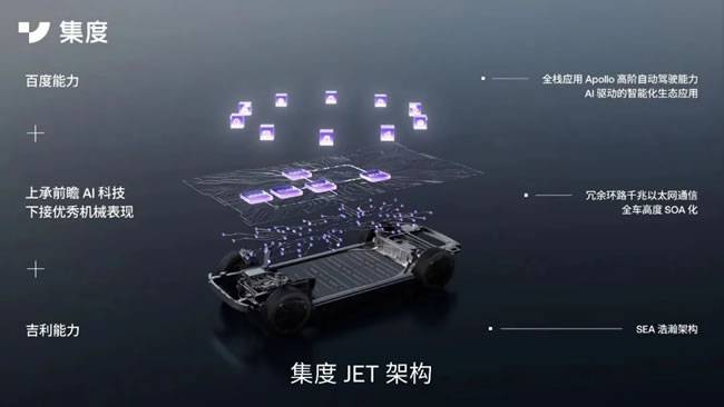 官方资料显示,JET是集度自研的承载AI能力并面向高阶智能驾驶的智能化架构,融合了电子电气架构EEA和整车级操作系统SOA,是实现了从域间到域内、从本地到云端的全融通的电子电气架构。