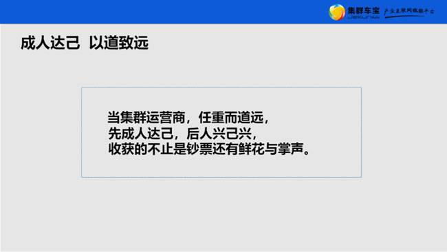 我最后给大家总结,想要当集群运营商,任重而道远。我刚才说了,“三新”,首先思维要给自己做一个变革,你要把旧的一切先抛掉,你要自己人空杯,你才能接受新的这一轮。第二,你要承担运营的任务还是很重的,所以叫任重而道远。