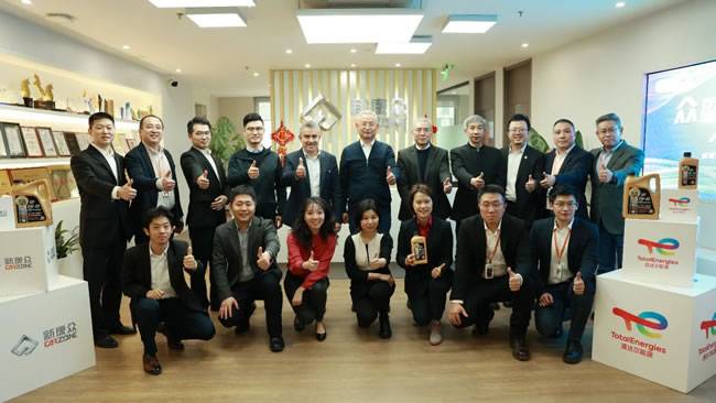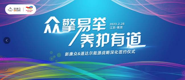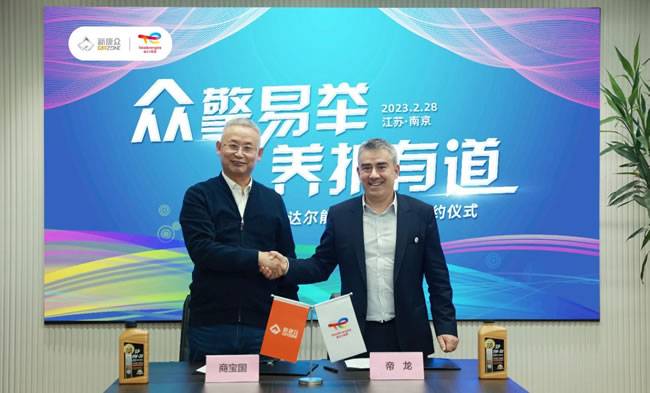 2023年2月28日,道达尔能源与新康众在新康众南京总部举行战略合作深化签约仪式,共同庆祝天猫养车定制润滑油产品-天猫养车优选全能9号的推出,以及达成“新康众轻连锁-金铁橡”项目长期合作约定。在道达尔润滑油(中国)有限公司董事总经理Stephane DION(帝龙),道达尔润滑油(中国)有限公司副总裁王啸晓,以及新康众CEO商宝国、新康众COO李逸及双方团队的共同见证下,共同签署了《道达尔能源与新康众深化战略合作备忘录》。