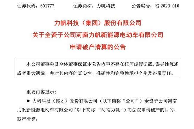 日前,力帆科技(集团)股份有限公司发布公告,旗下全资子公司河南力帆新能源电动车有限公司向法院申请破产清算,河南力帆由重庆力帆新能源汽车有限公司100%持股。