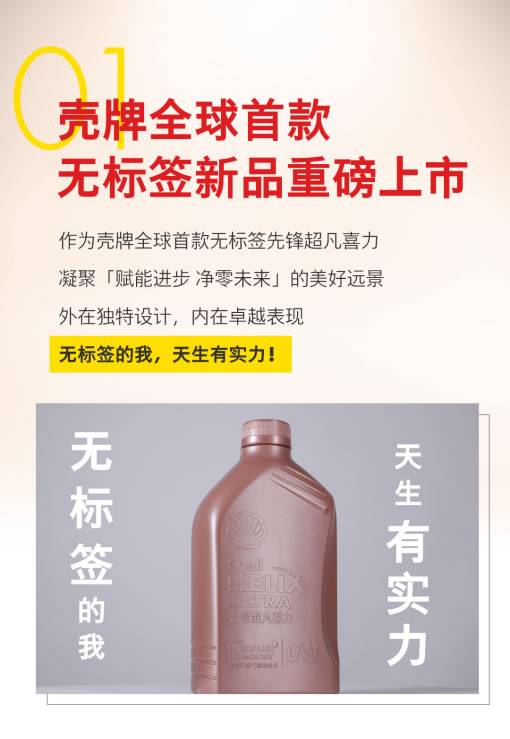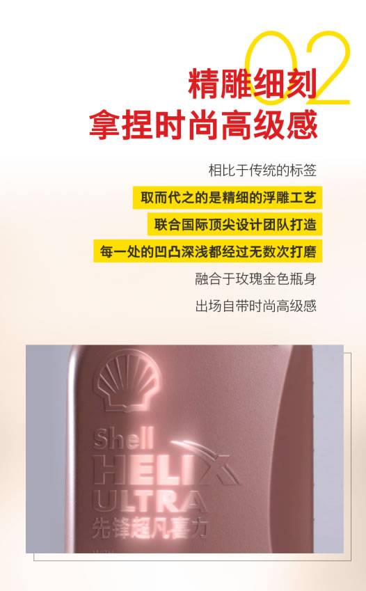 壳牌全新无标签先锋超凡喜力“撕掉”传统标签,以精细浮雕工艺取代,联合国际顶尖设计团队创造,角度、大小、深浅、凹凸等细节经多次打磨研发,将浮雕设计融合于玫瑰金色瓶身,使之更具时尚感与辨识度。与众不同的质感给予消费者耳目一新的视觉体验,为市场注入新活力,带来更为精致的润滑体验。