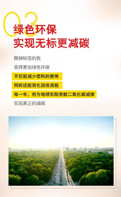 践行减碳理念,实现绿色环保。无标签先锋超凡喜力的设计去除了原先瓶身处的塑料标签,因此不仅直接减少了生产过程中材料和能源的使用,更由于其瓶身为单一材料而简化了回收过程中瓶标分离的步骤,节约分离所需的人力成本和资源,提高回收利用率,有效减少能源过度使用引起的碳排放,实现绿色可持续发展。