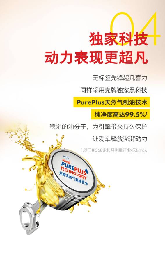 卓越品质,精益求精,超凡表现,一如既往。无标签先锋超凡喜力采用壳牌独家黑科技——PurePlus天然气制油技术,由天然气提炼而成,纯净度高达99.5%1。纯度更高,油耗更低,稳定的机油分子,为引擎带来持久保护,让爱车释放澎湃动力。不仅被大众集团VW Standard 502.00、梅赛德斯奔驰MB-Approval 229.52等行业标准认可,更通过抗高温性能、防油泥程度、清洁力、耐久度等多项考核,助力发动机拥有超凡动力。消费者的每一段路,都有壳牌无标签先锋超凡喜力安心守护。
