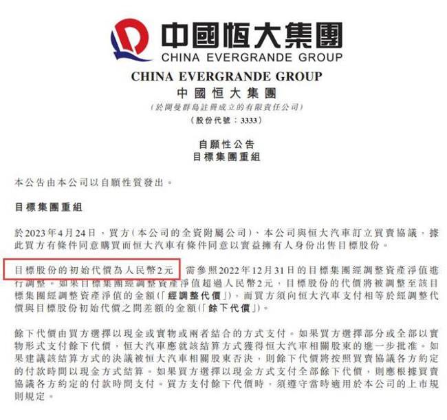 根据公告,目标股份的初始代价为人民币2元,需参照2022年12月31日的目标集团经调整资产净值进行调整。为何交易代价仅有2元?恒大汽车指出,由买卖协议订约方经公平磋商后厘定,截至2022年12月31日,目标公司的未经审核负债净额约247.89亿元,独立物业估值师于2023年2月28日就项目得出的估值约601.54亿元。