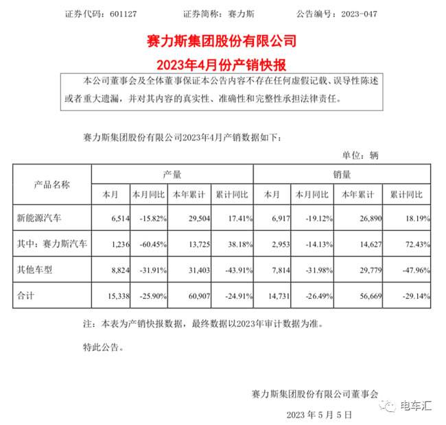 5月4日,赛力斯发布4月产销快报,4月新能源汽车销量为6,917辆,同比下降19.12%;其中赛力斯汽车销量为2,953辆,同比下降14.13%。目前与华为深度合作的问界品牌就是由赛力斯生产的,因此赛力斯的销量基本可以等同于华为问界的销量。