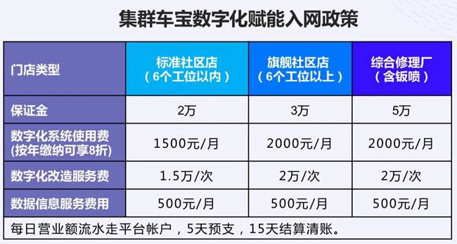 在原有不收加盟费、保留原有品牌、不收品牌使用费、不要求重新装修的基础上,2023年集群车宝进一步降低入网门槛,对存量门店进行数字化改造升级,具体政策改变如下: