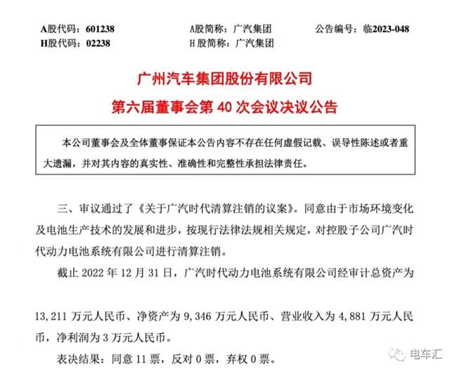 6月8日,广汽集团发布公告称,公司董事会审议通过了《关于广汽时代清算注销的议案》,同意由于市场环境变化及电池生产技术的发展和进步,按现行法律法规相关规定,对控股子公司电池系统公司进行清算注销。该公司由广汽集团与宁德时代合资成立,广汽埃安新能源和广汽集团分别持股26%、25%,宁德时代持股49%。