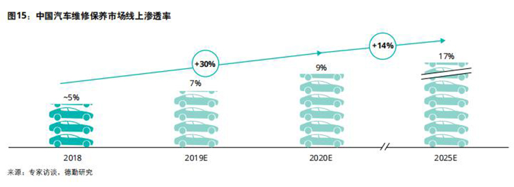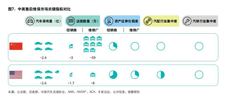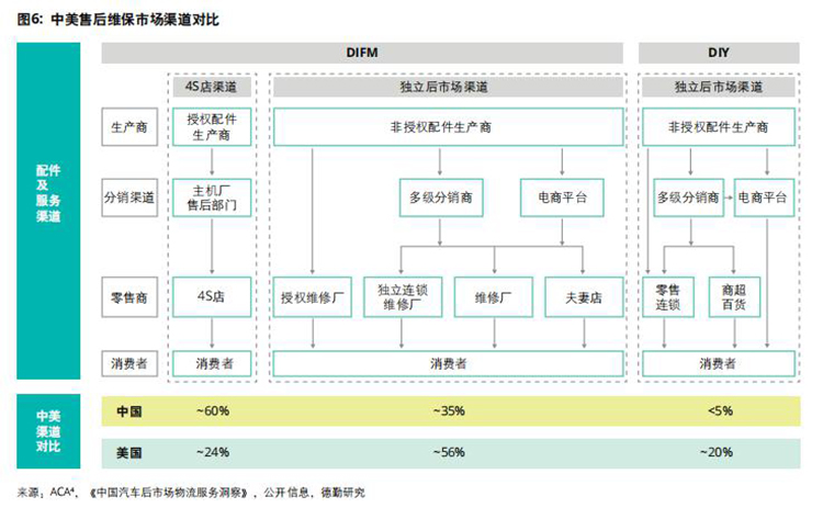 以美国汽修市场为例,70%的“脱保”车辆通过独立后市场渠道接受售后维保服务,而在欧洲市场独立后市场渠道同样占据主导,在波兰、英国、西班牙等国家独立后市场渠道份额达到60%以上,而在中国,独立后市场渠道份额不足40%。