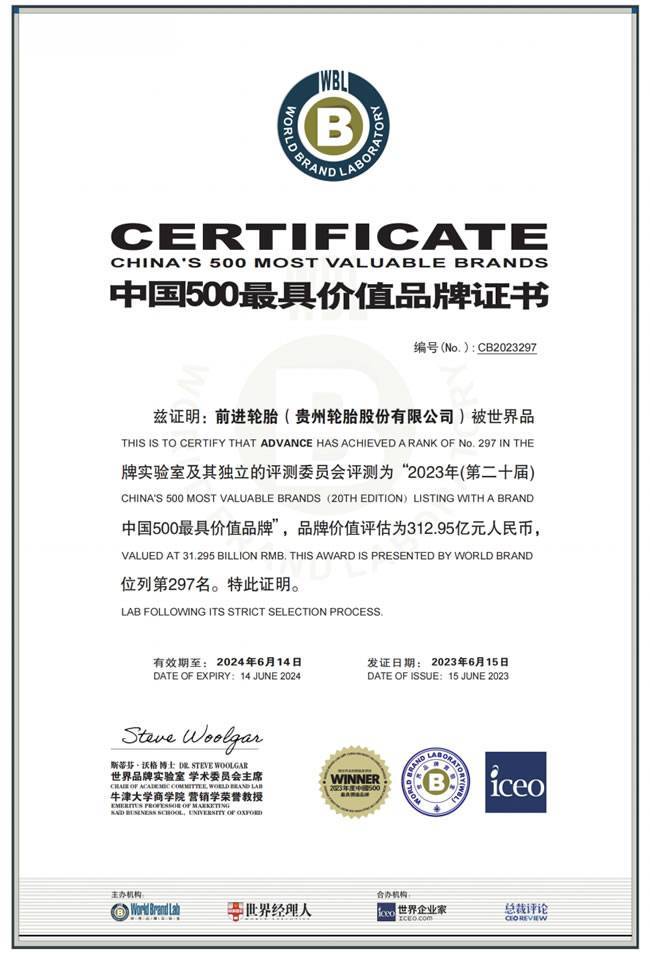 世界品牌实验室(World Brand Lab)是一家国际化的品牌价值研究机构,其研究成果已经成为许多企业无形资产评估的重要依据。连续二十年发布的《中国500最具价值品牌》,采用“收益现值法”对品牌价值进行测评。在这份基于财务数据、品牌强度和消费者行为分析的年度报告中,贵州轮胎前进品牌以价值312.95亿元人民币位列2023年(第二十届)中国500最具价值品牌297名,品牌价值同比增加42.3亿元人民币,贵州轮胎前进品牌已经迈进国际化品牌阵营。