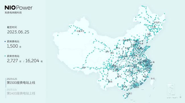 6月25日,蔚来汽车宣布,截至2023年6月25日,蔚来全国换电站布局数量突破1500座,累计建成16204根充电桩,2023年新增1000座换电站,年底将超2300座。