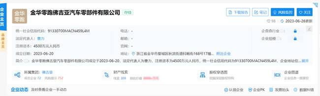 6月28日消息,据企查查显示,金华零跑佛吉亚汽车零部件有限公司于近日正式成立,法定代表人为曹力,注册资本4500万人民币,经营范围含汽车零部件及配件制造、汽车零配件零售、技术服务、货物进出口等。