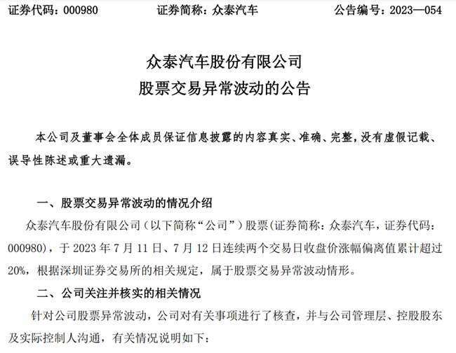 进入7月,众泰汽车股票连续两个交易日收获涨停板。因股价持续大涨,7月12日,众泰汽车发布股票交易异动公告称,公司初步预计2023年上半年净利润为负值,但尚未统计出具体数字。