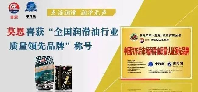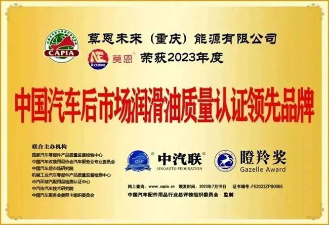 莫恩润滑油经过严格甄选,经过多维度评估后,在汽车后市场众多润滑油企业中脱颖而出,荣获“汽车后市场润滑油质量认证领先品牌”荣誉称号,这是对莫恩润滑油的充分认可与肯定。