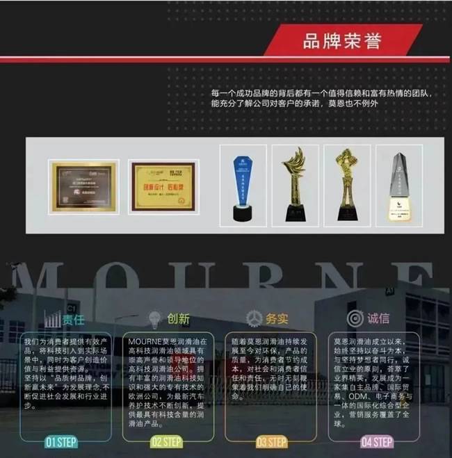 莫恩,作为法国MOURNE大规模润滑油出口商,莫恩润滑油进入中国市场已有3年多年的历史,为中国用户提供了一系列的高质量产品,得到用户的认可。经过长期发展,莫恩润滑油已赢得行业及市场的充分认可,面向未来,将立足于品牌建设、产品创新、坚持品质与服务为总基调,为广大客户与车主提供更加优质、可靠的产品与服务。