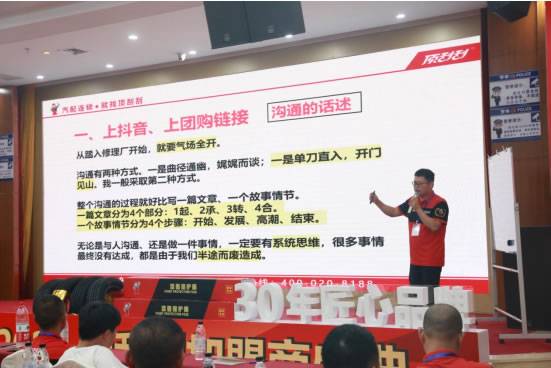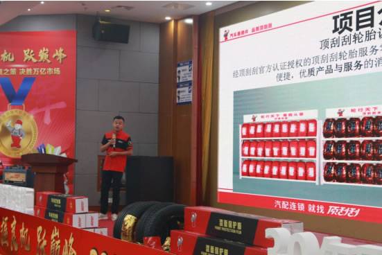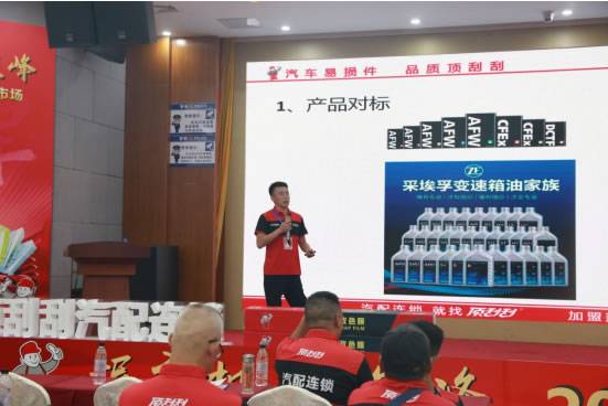 在顶刮刮汽配董事长夏建军先生进行会议开场致辞之后,科学养车事业部总经理李瑞虹先生、品牌部经理董涛、顶刮刮汽配山东分公司冯太白先生,纷纷就产品发展规划、科学养车提升门店营业额和抖音团购拓客的规划发表了演讲。