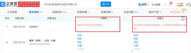 企查查显示,近日,北汽蓝谷新能源科技股份有限公司发生工商变更,注册资本由约42.87亿元增至约55.74亿元。