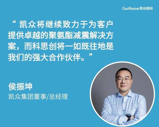凯众致力于为每辆车提供安全与舒适,以聚氨酯材料方案为基础,为客户提供整车级NVH解决方案。同时凯众不断探究聚氨酯材料在汽车领域的更多应用,与科思创的长期战略合作将为此打下坚实基础。