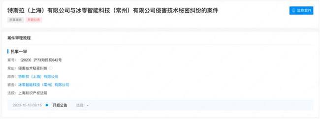 9月6日最新消息,根据企查查显示,特斯拉(上海)有限公司与冰零智能科技(常州)有限公司侵害技术秘密及不正当竞争纠纷案件定于10月10日在上海知识产权法院开庭审理。