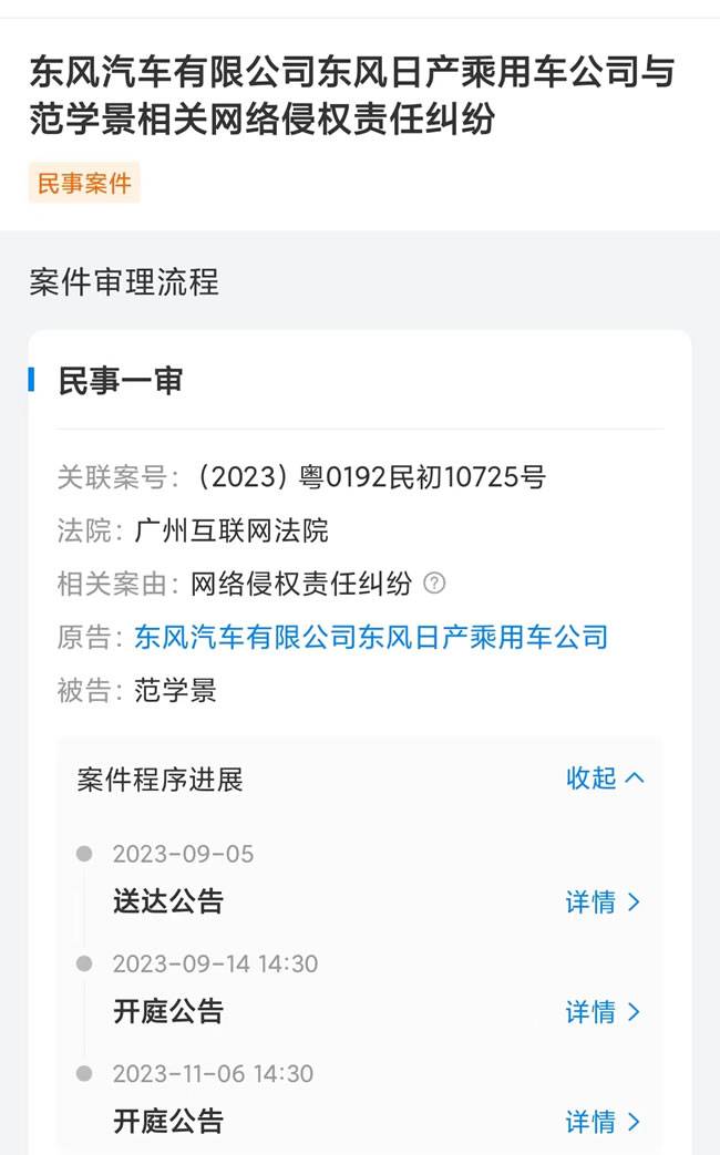 天眼查App显示,东风汽车有限公司东风日产乘用车公司诉范某某网络侵权责任纠纷一案将于9月14日开庭,9月5日广州互联网法院已经向范某某送达公告。
